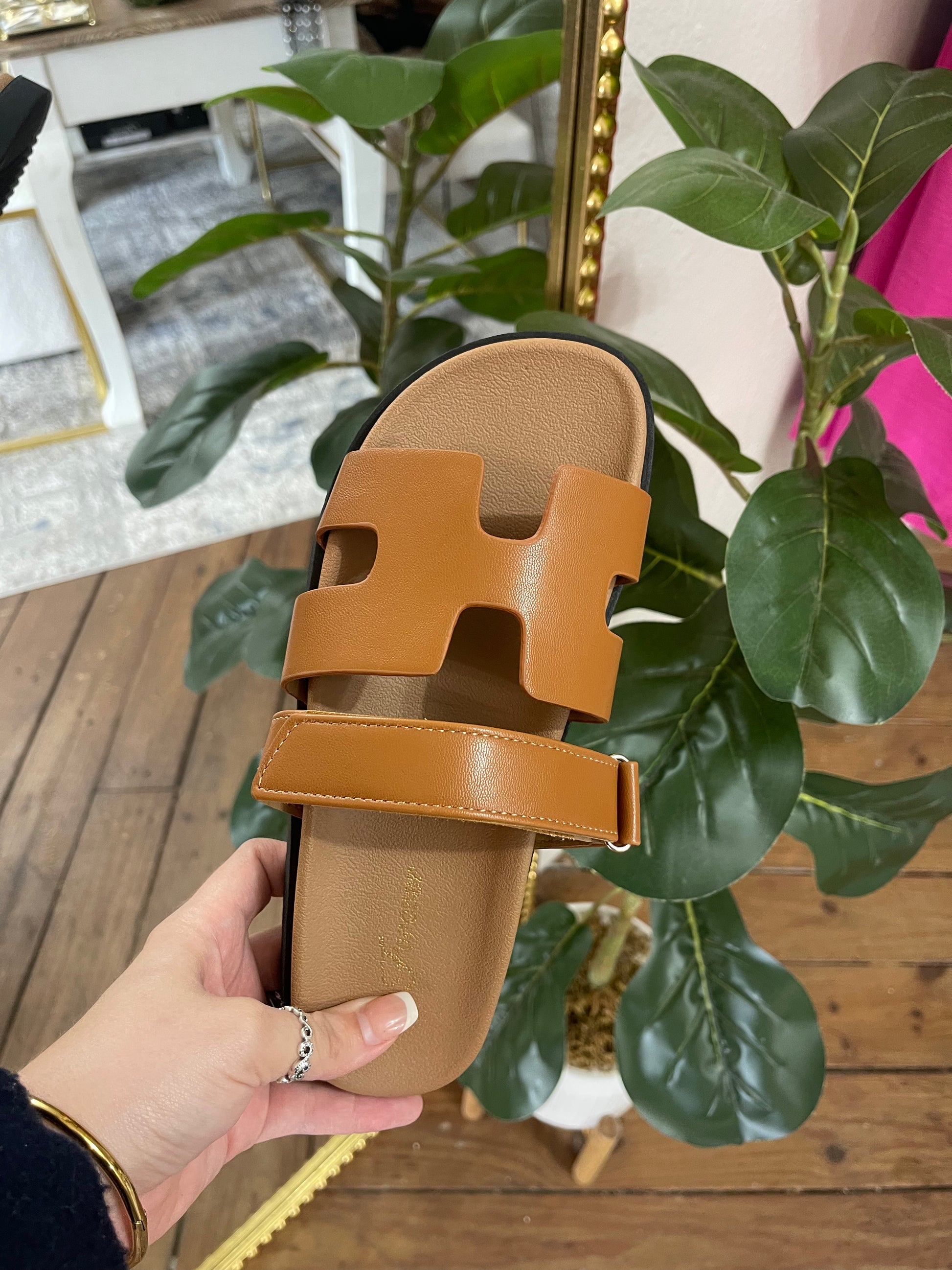 -Flatform slide sandal -Cut-out upper design -Front adjustable velcro strap -Faux leather -Slip-on style -Molded footbed -Rubber platform
