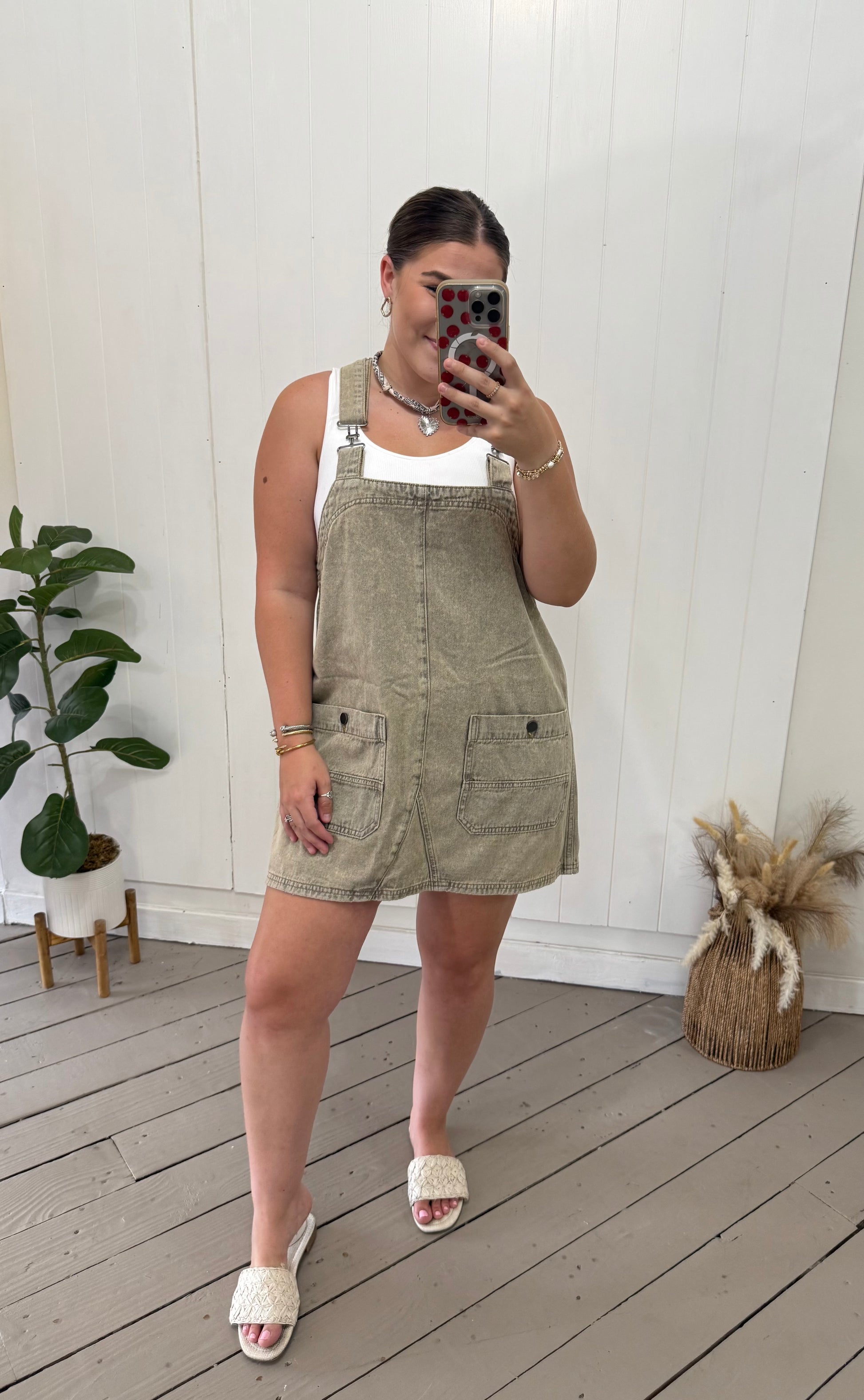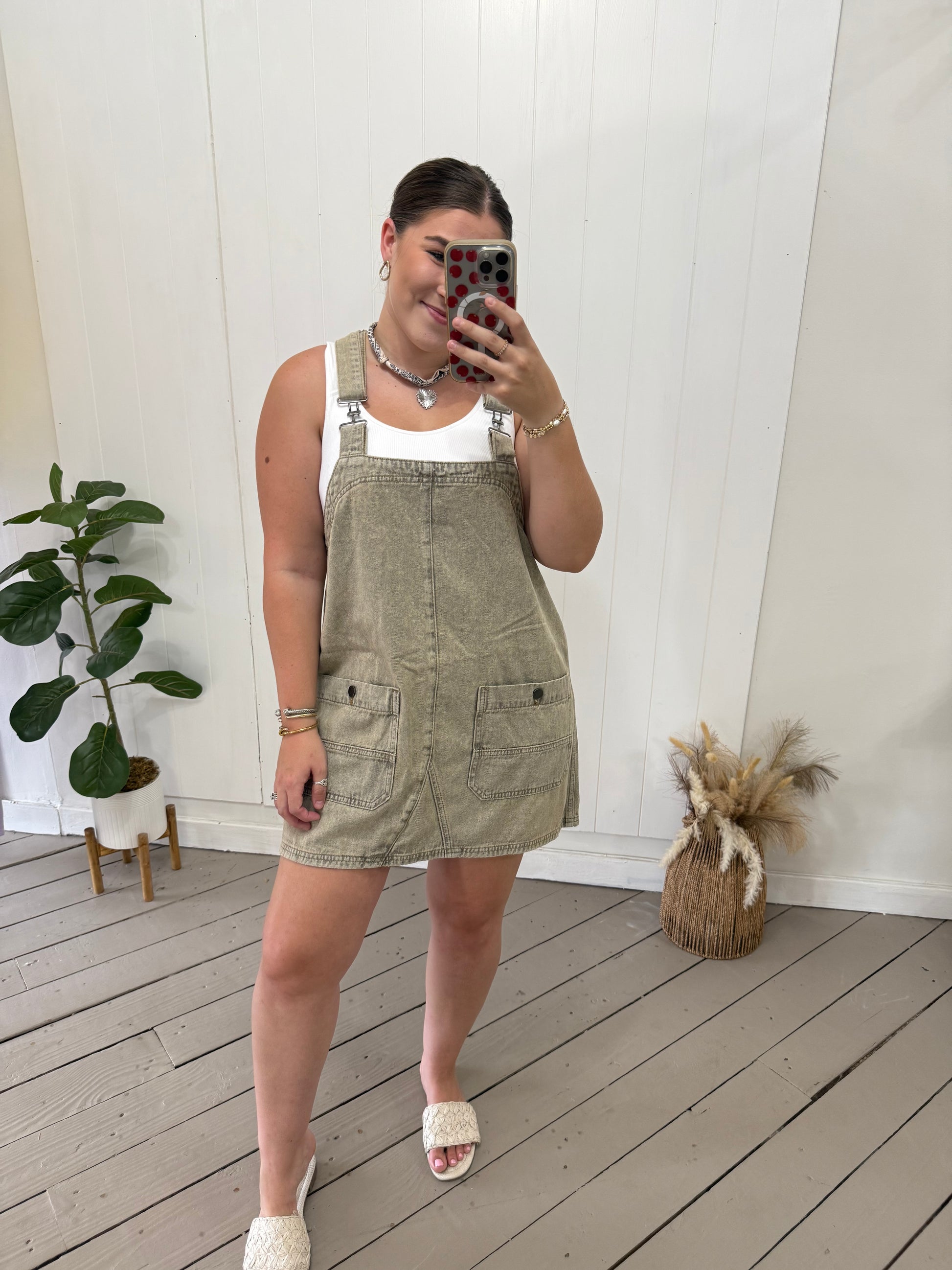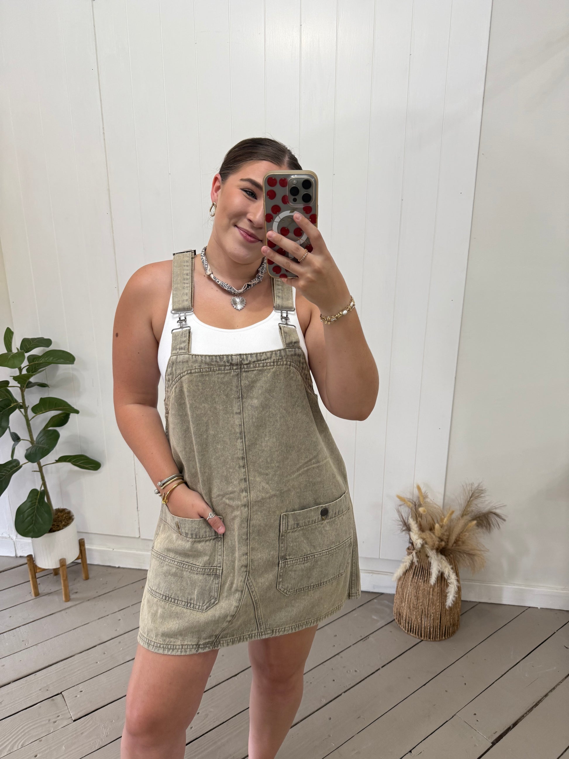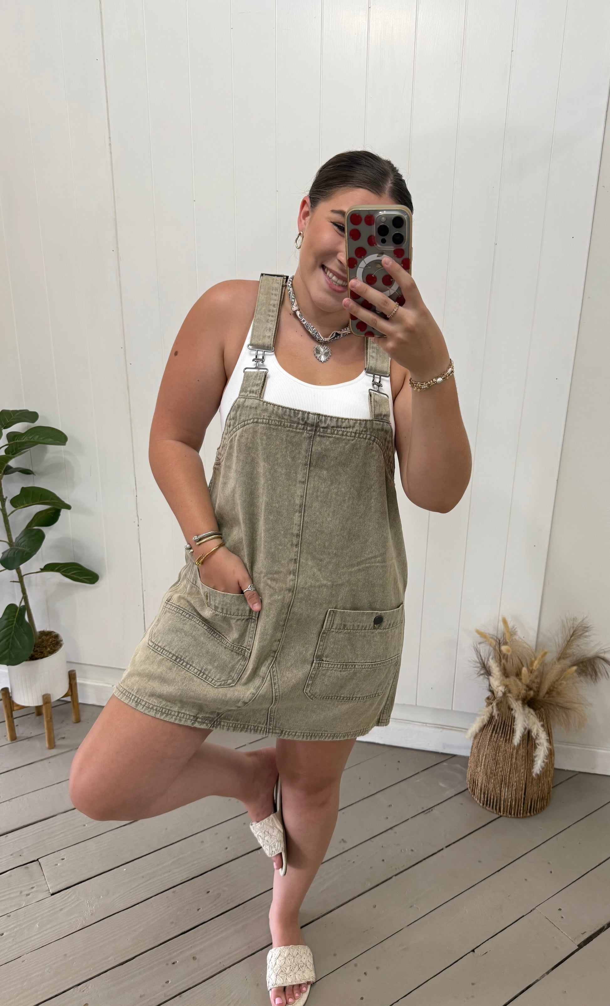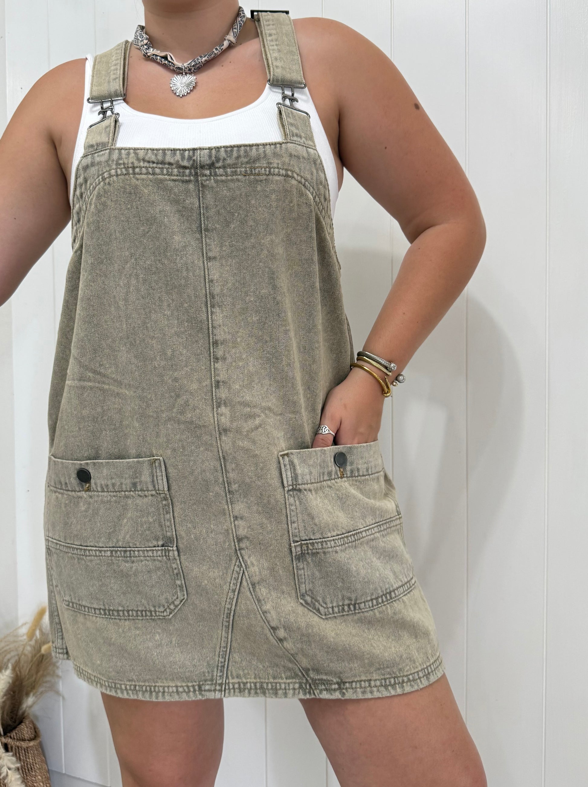 Snow washed mini overall dress featuring a square neckline, adjustable straps with hook fastenings, two open front pockets with button closures, added seams throughout for detail and is a boxy silhouette