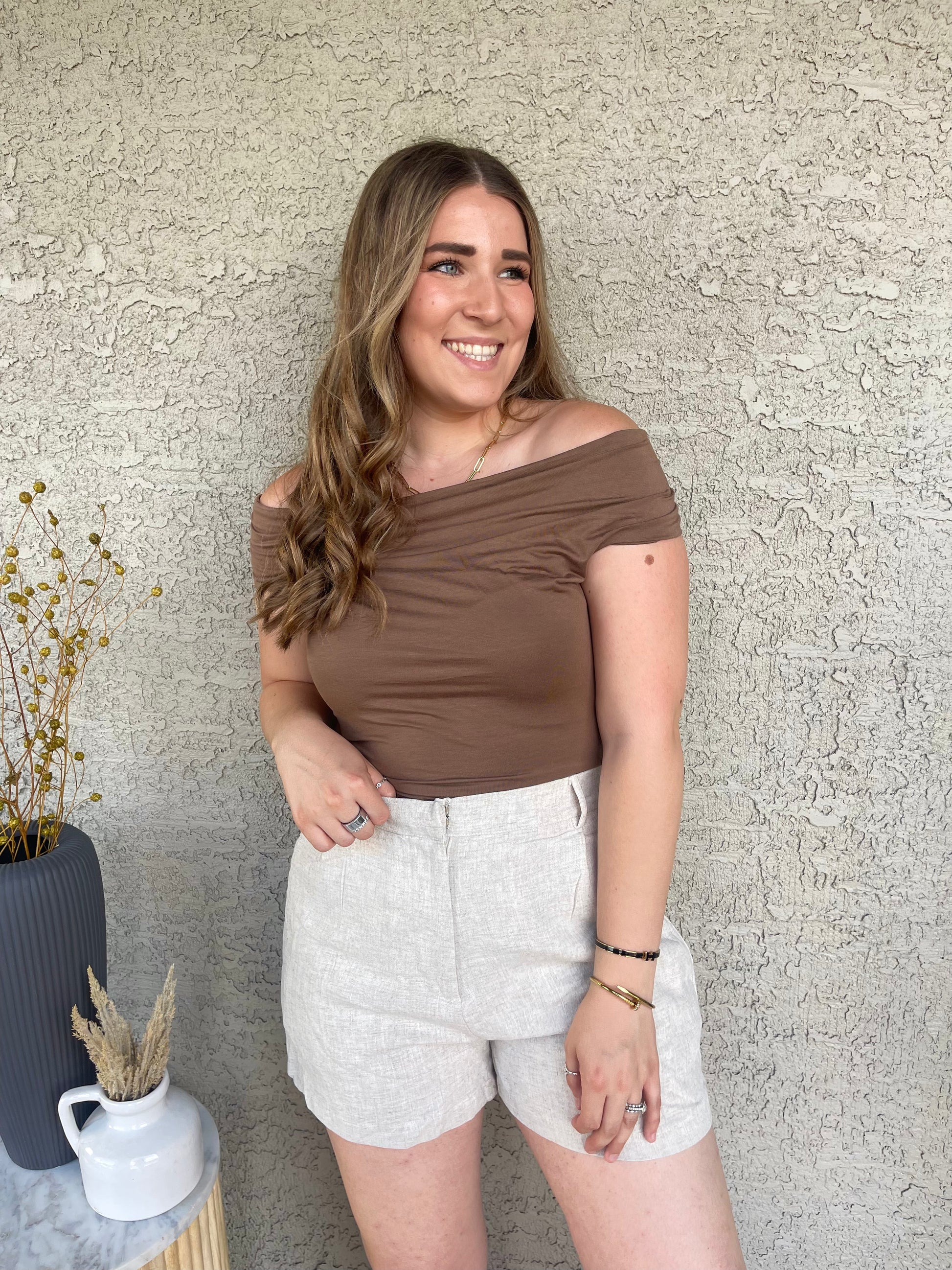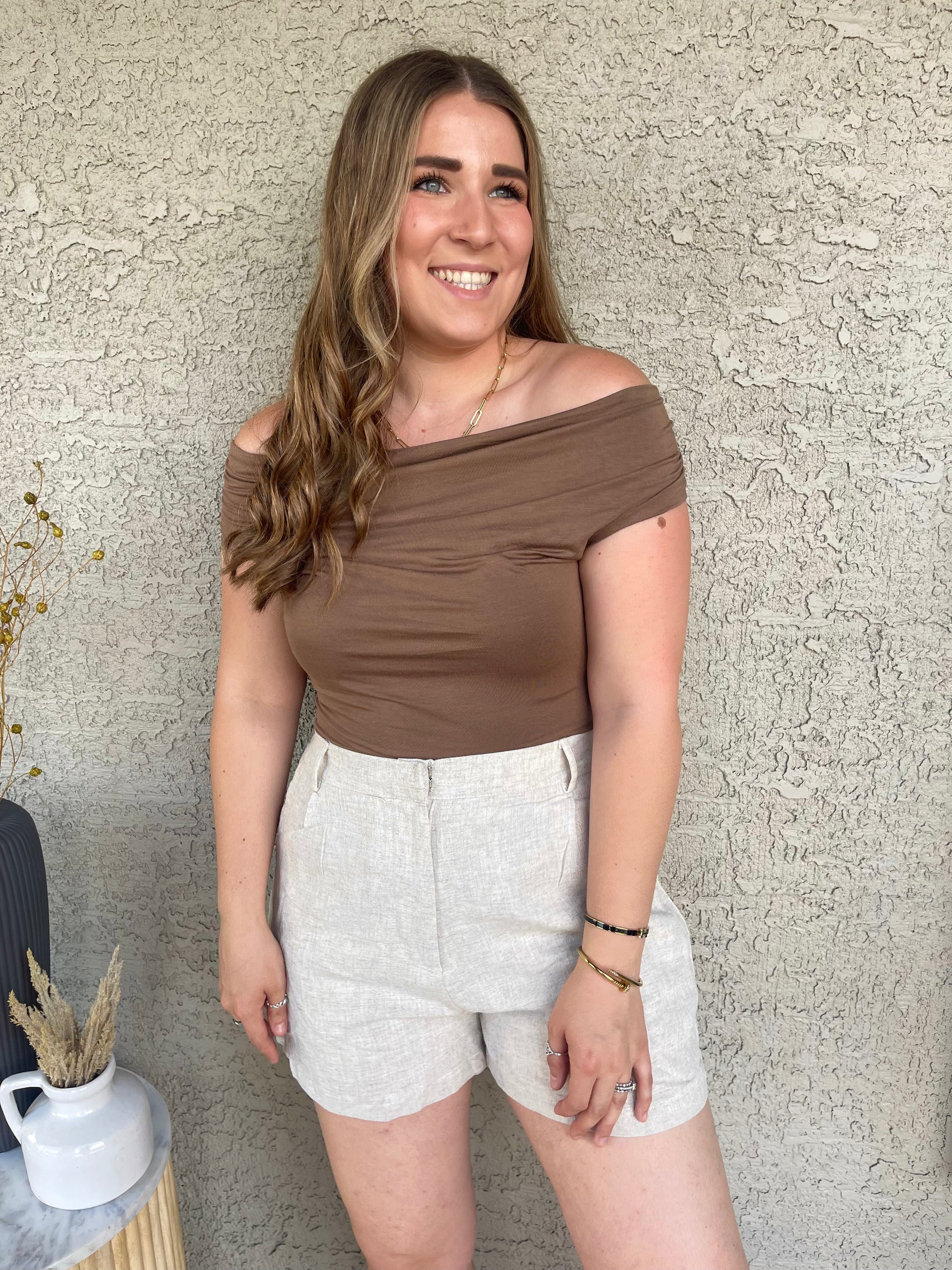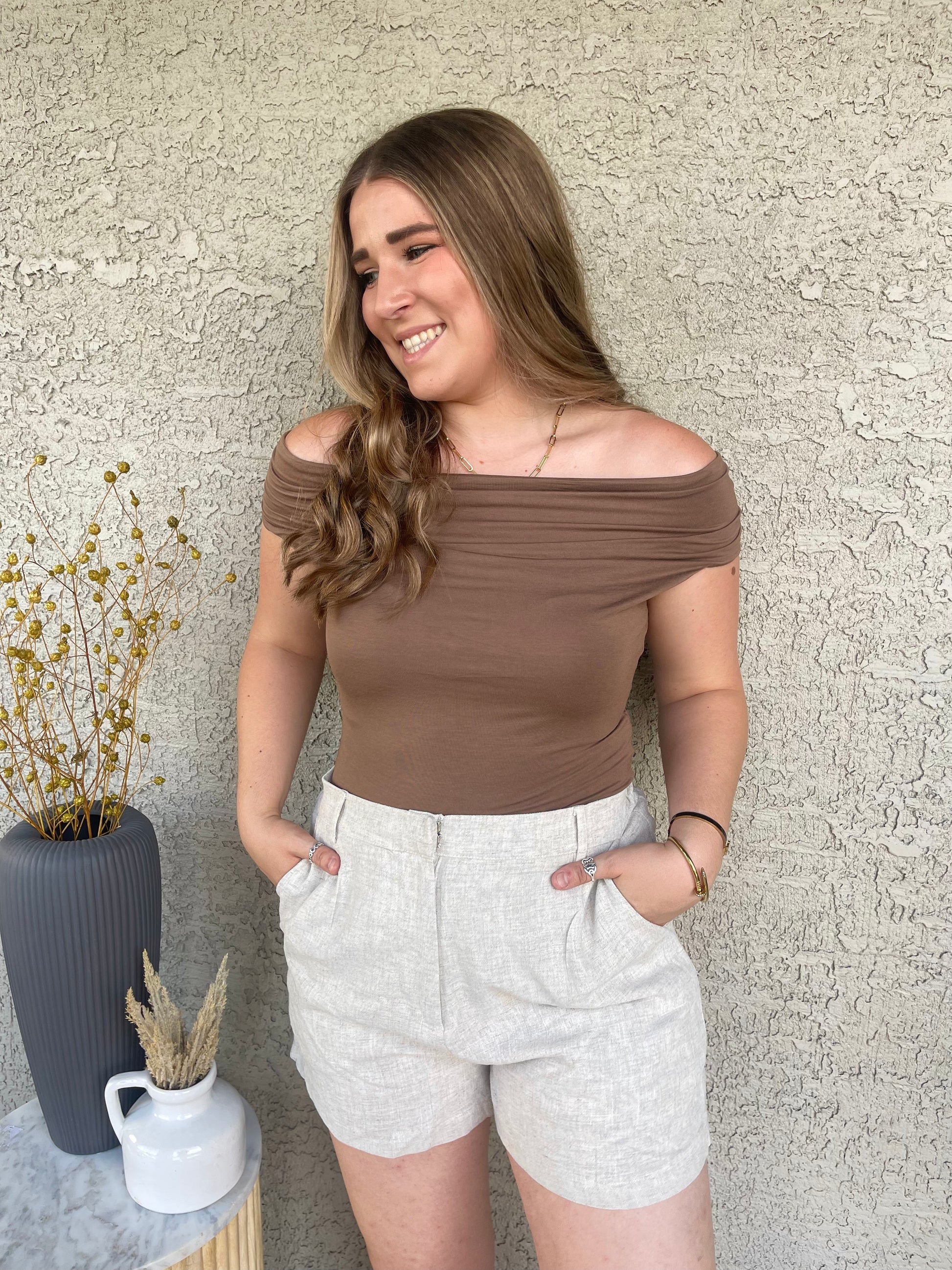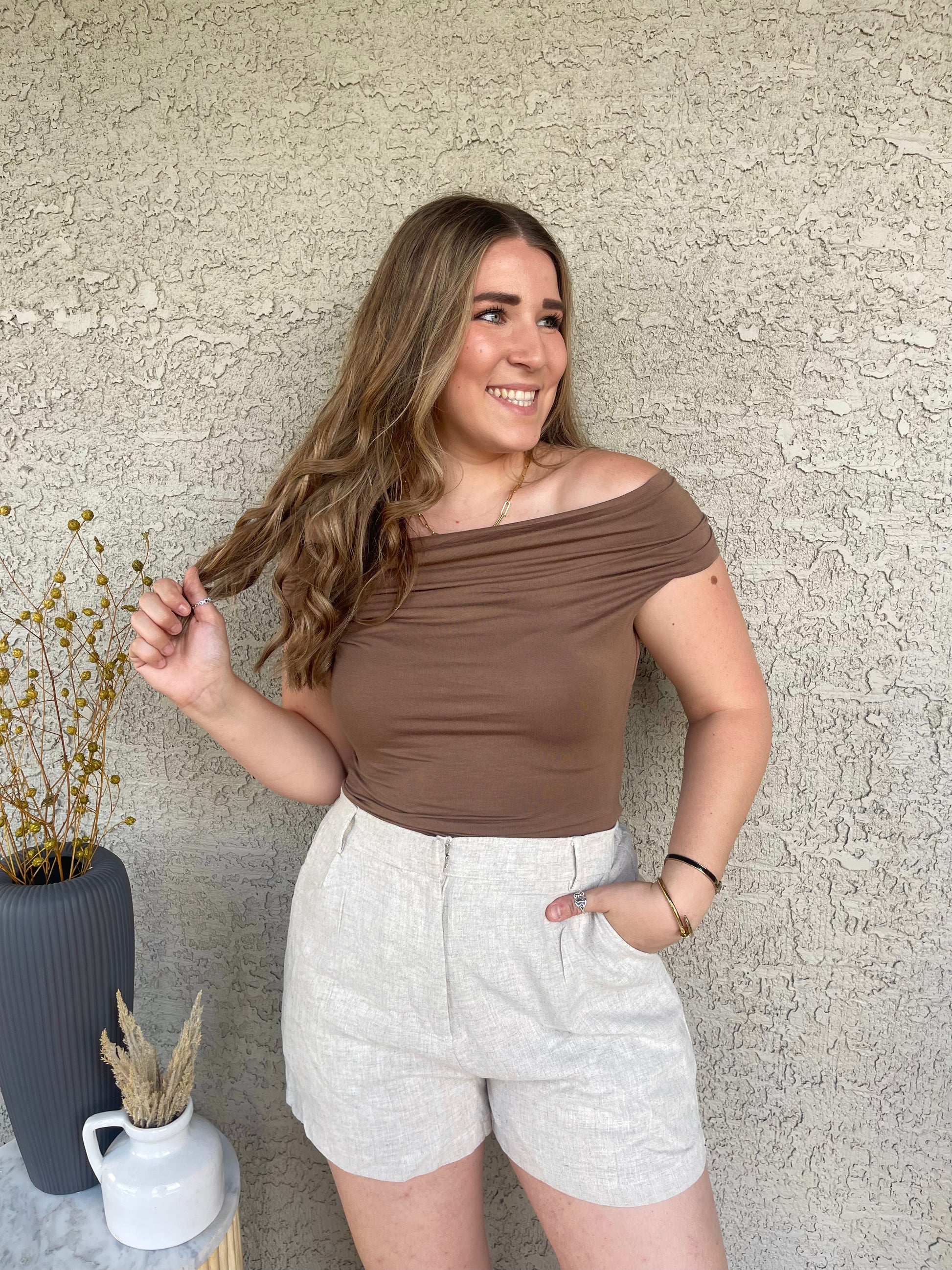 MOCHA REVERSIBLE OFF THE SHOULDER KNIT TOP