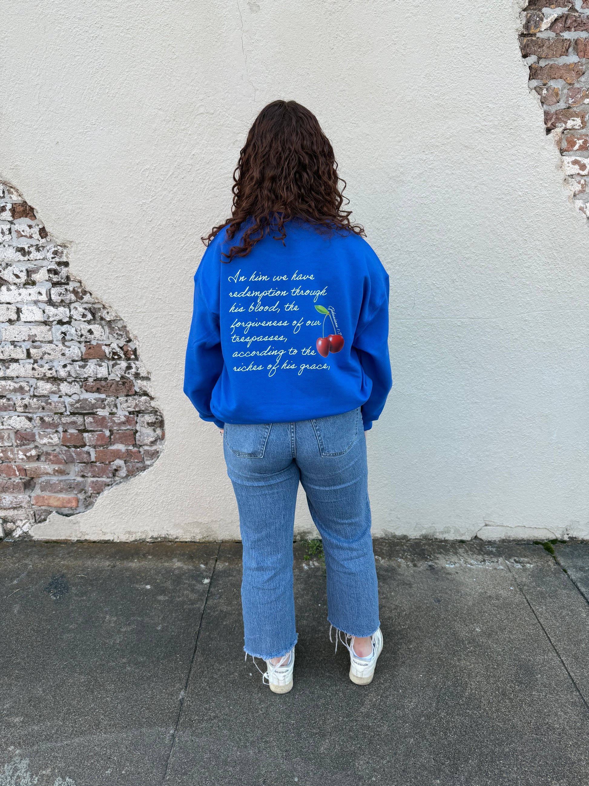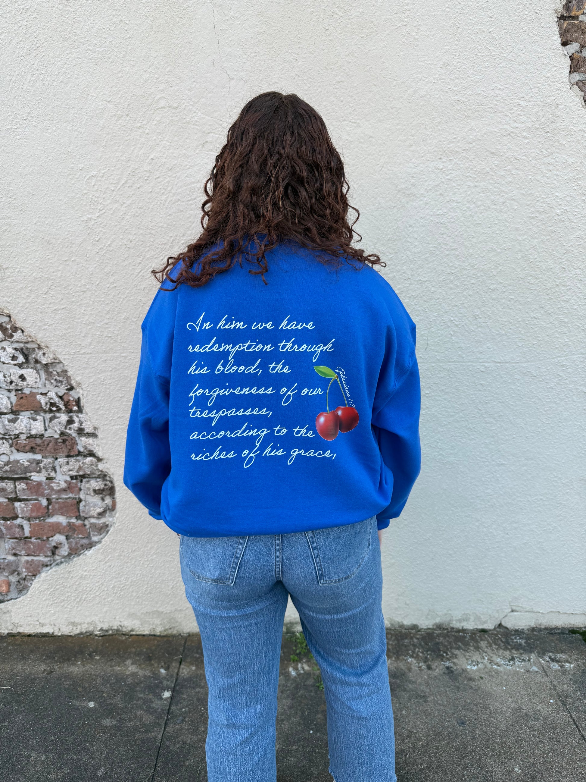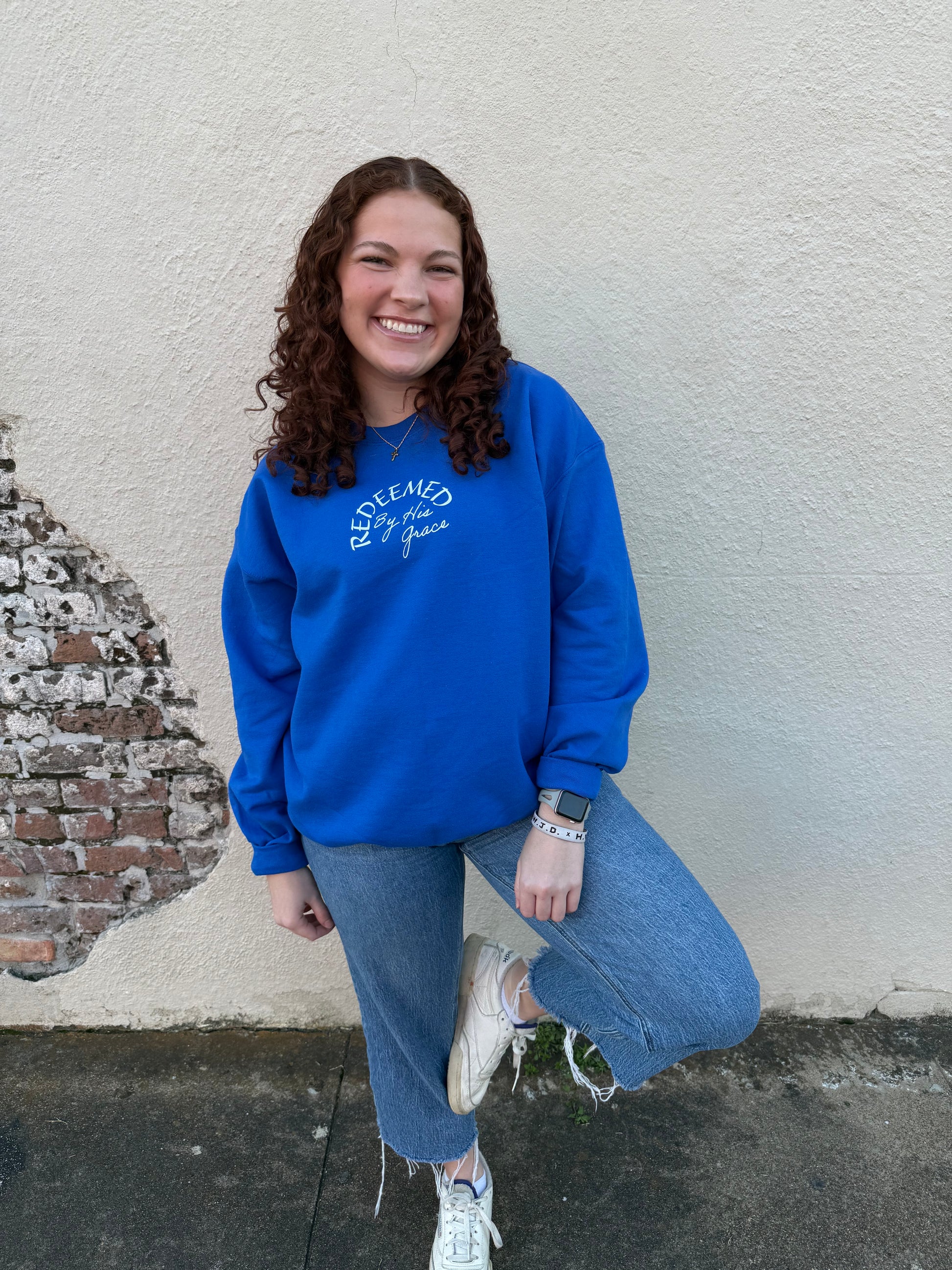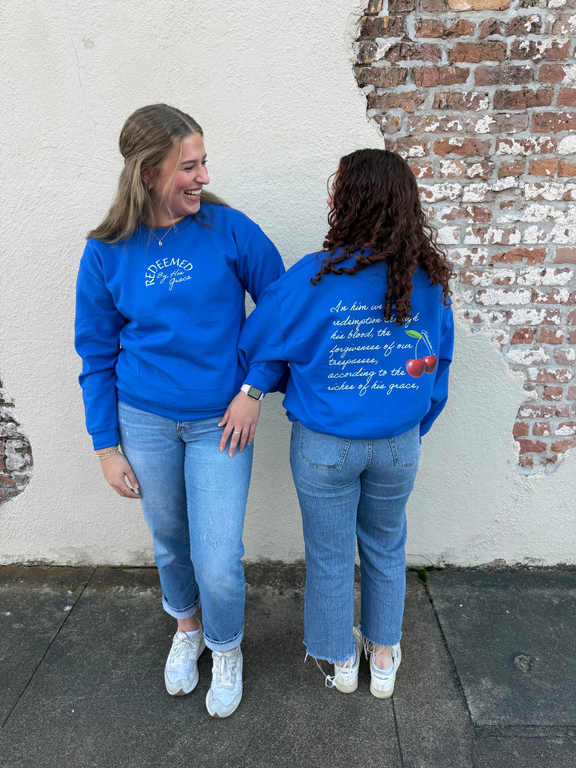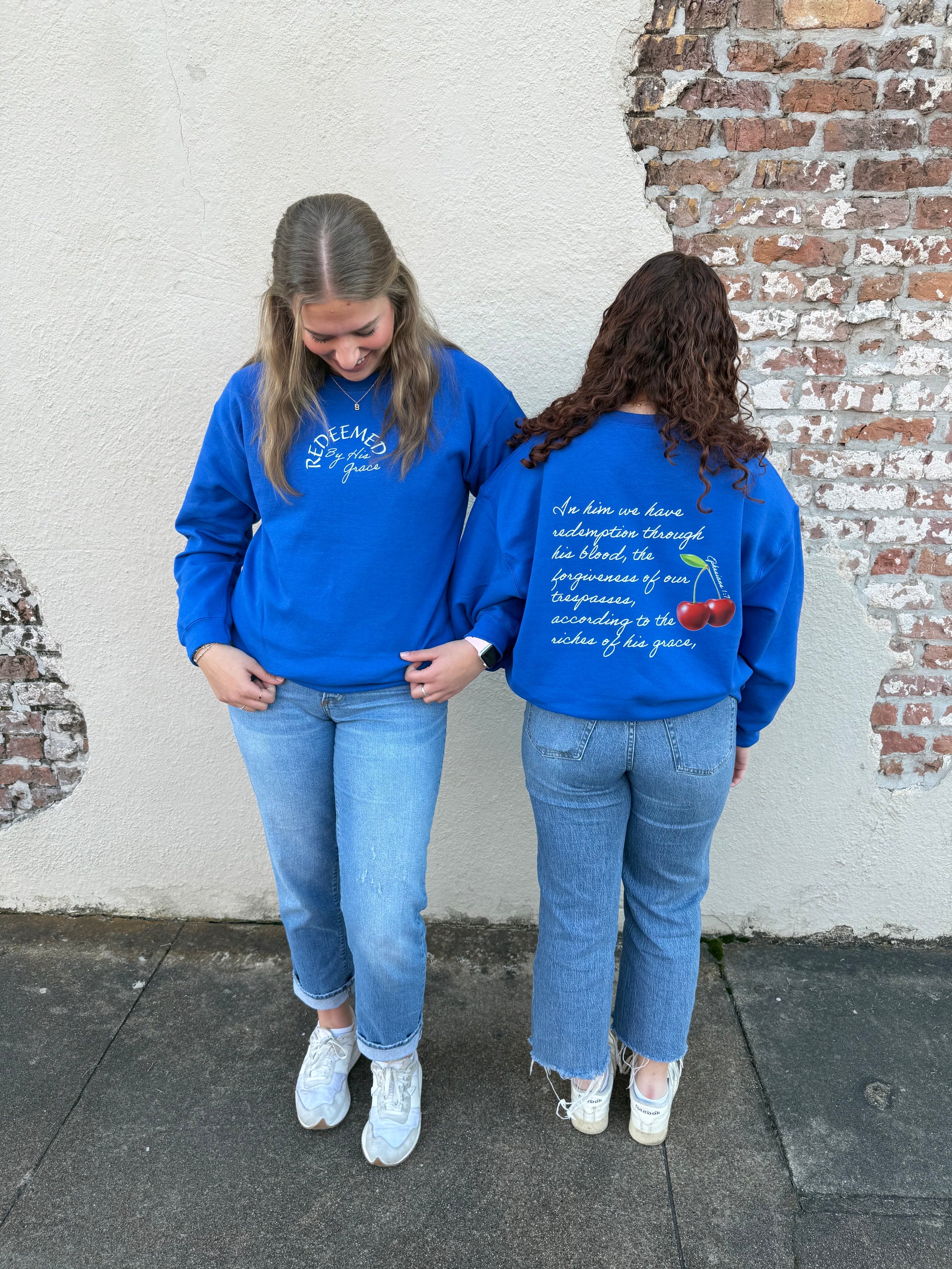 REDEEMED BY HIS GRACE SWEATSHIRT (front) Ephesians 1:7 (back)