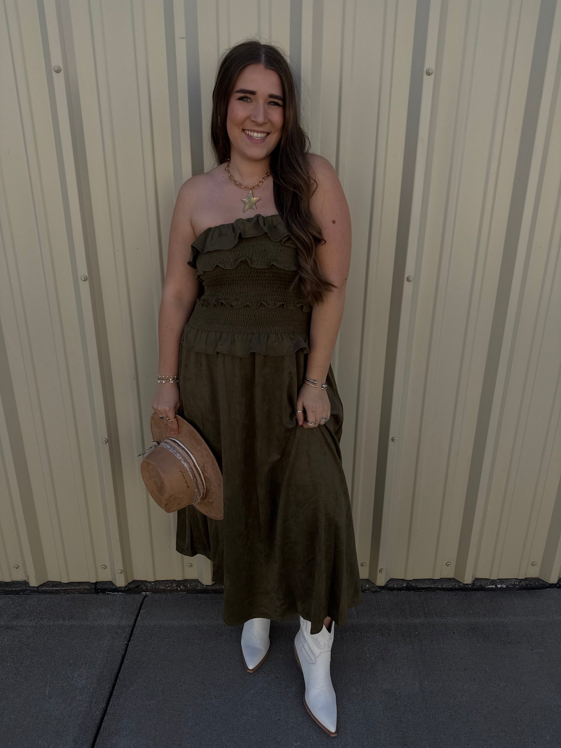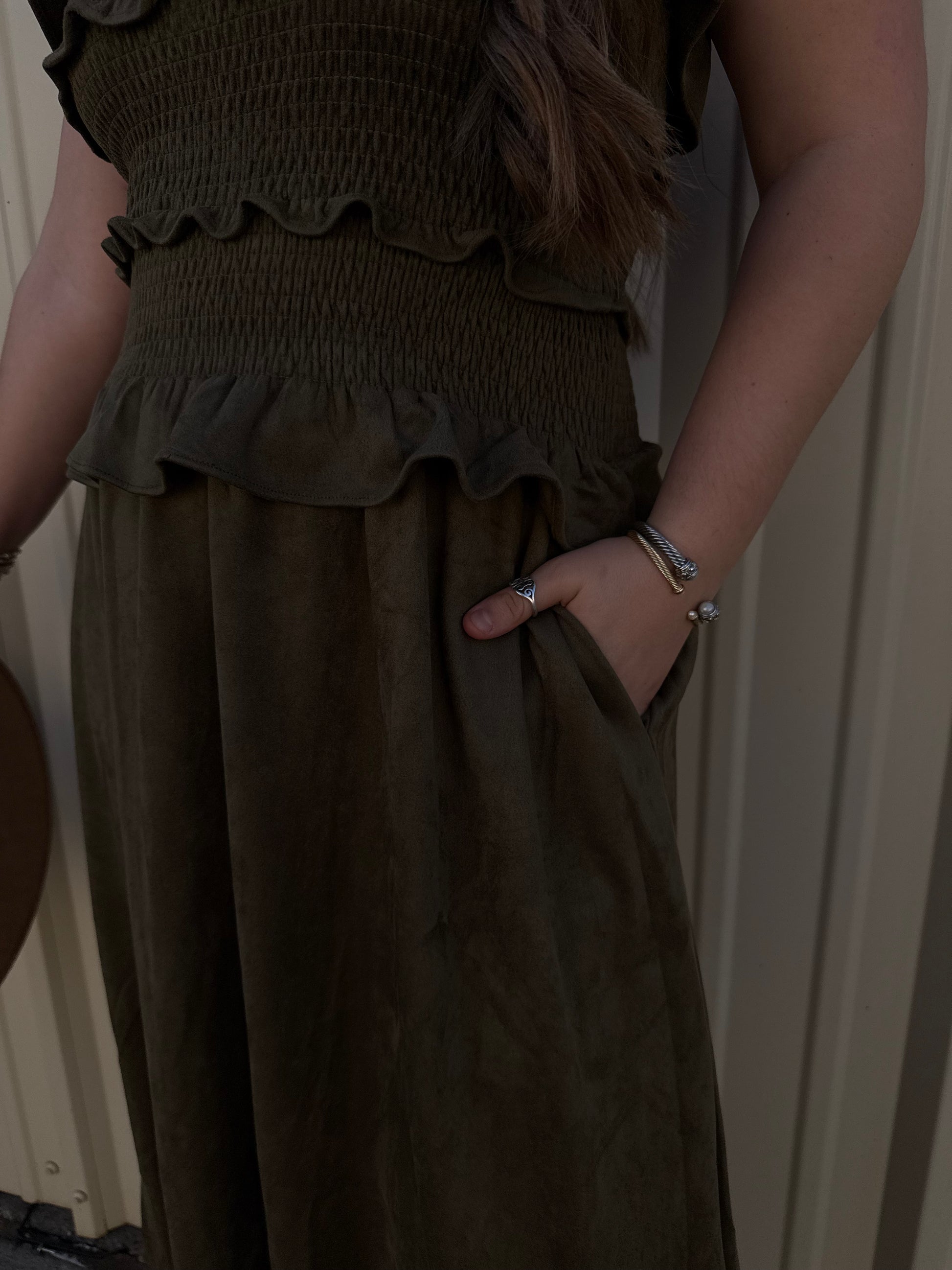 GREEN SUEDE MAXI TUBE RUFFLED DRESS