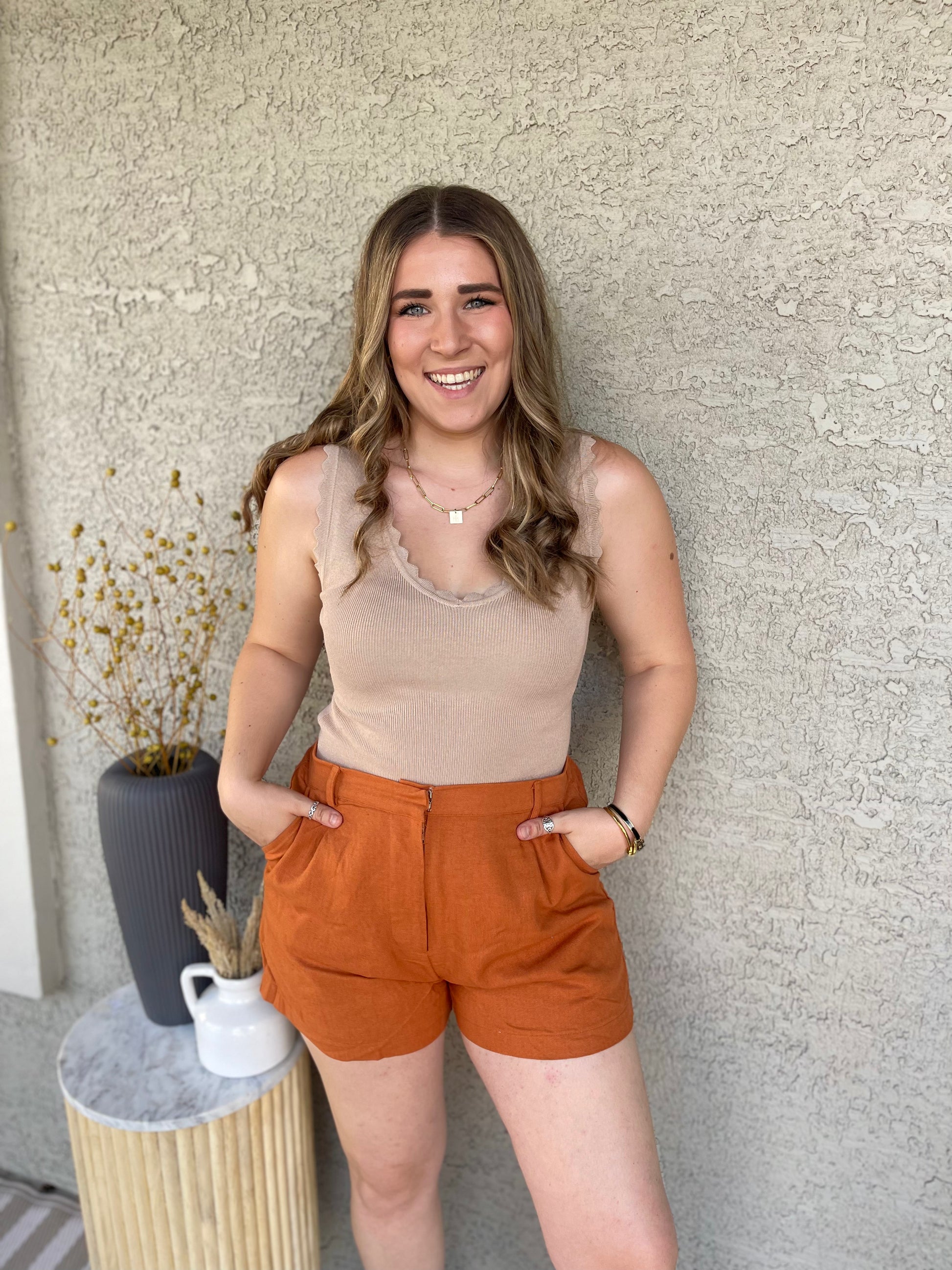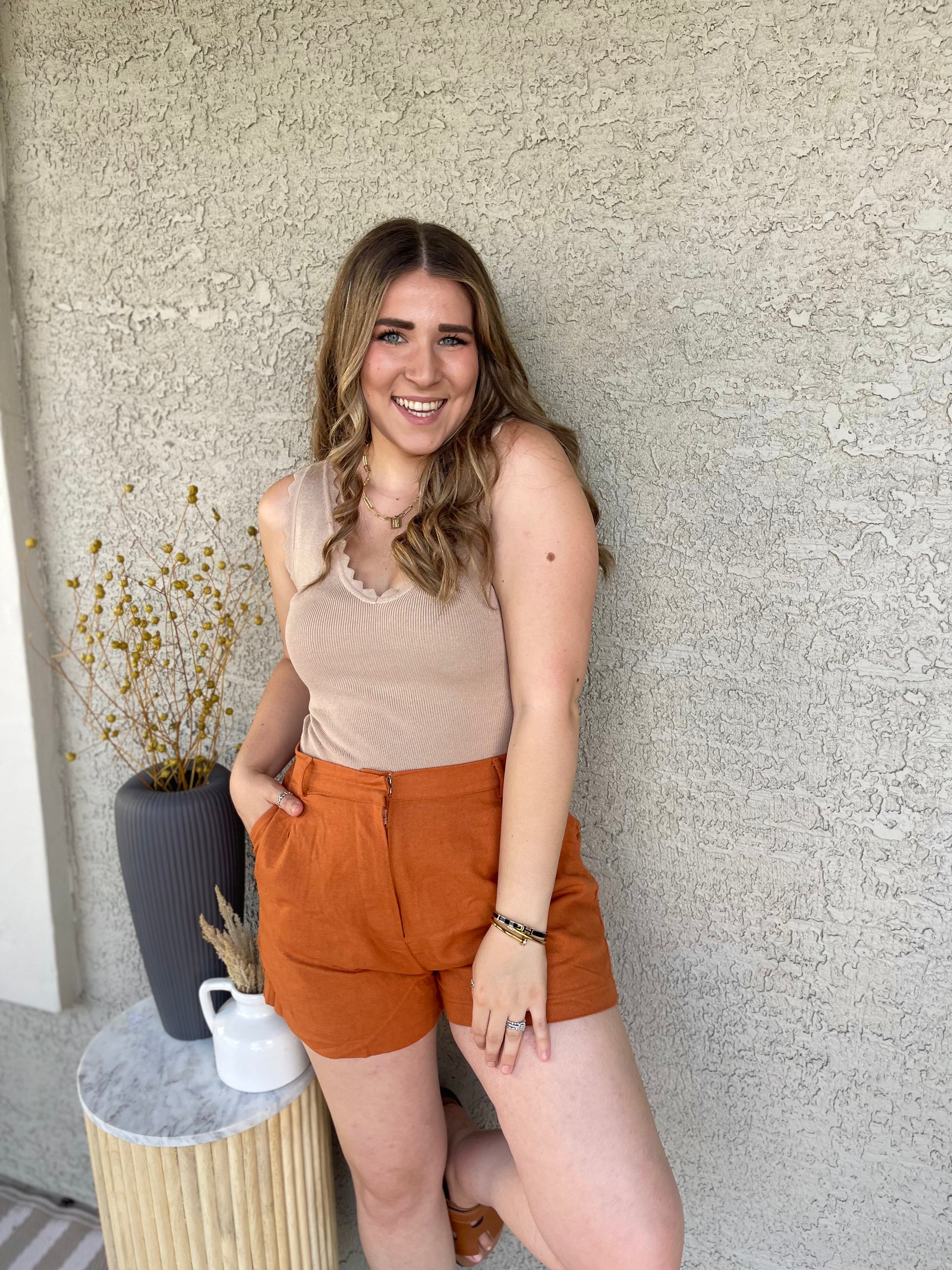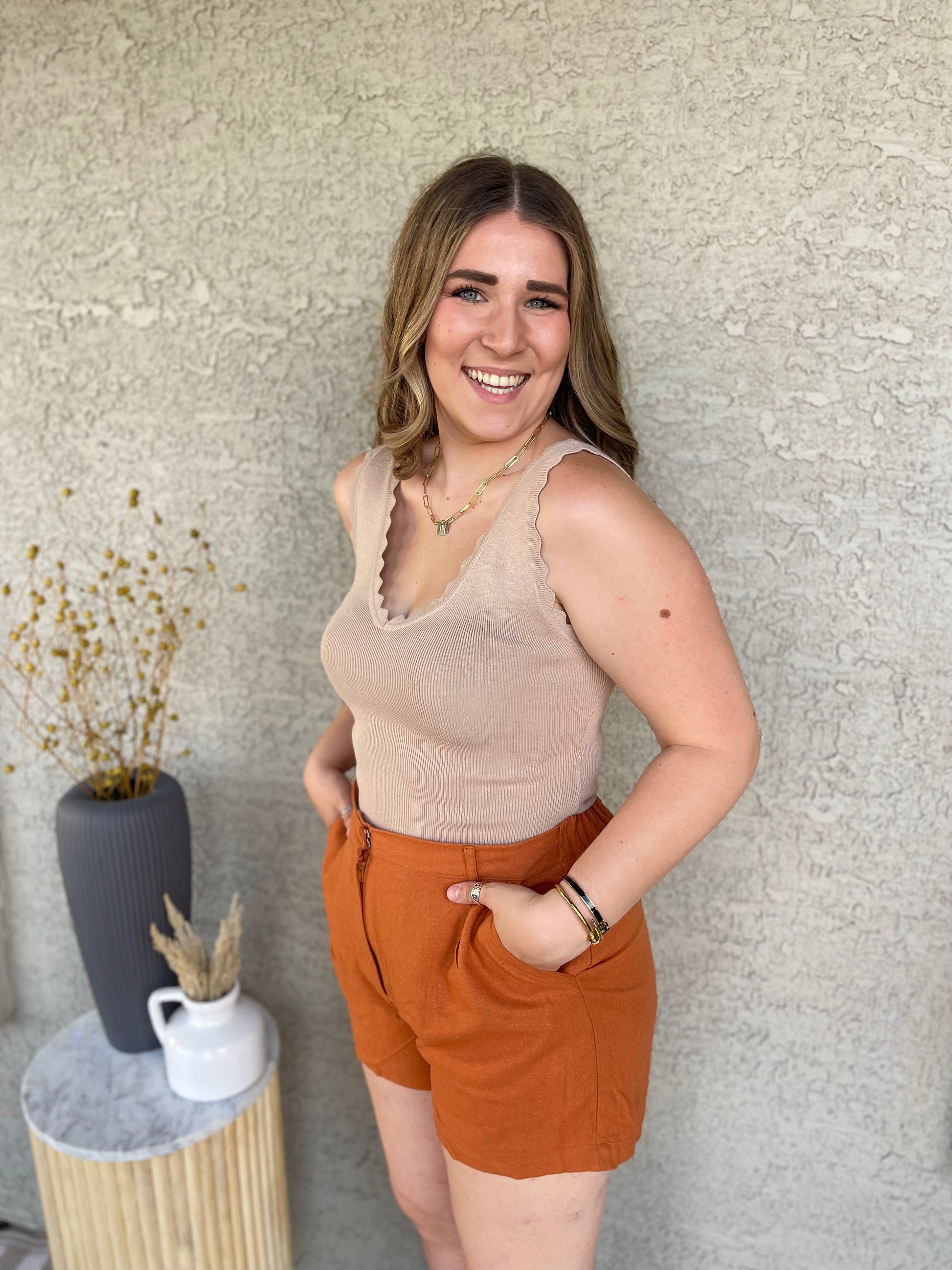 TAUPE SCALLOP EDGE SLEEVELESS SWEATER KNIT CROP TOP